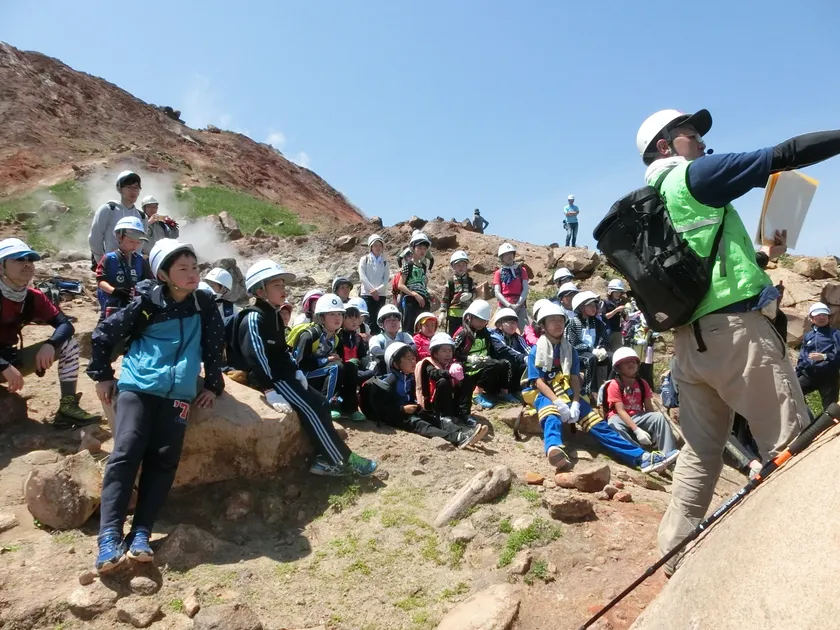 昭和新山ジオツアー減災文化継承プログラム 子供郷土史講座でガイドする様子