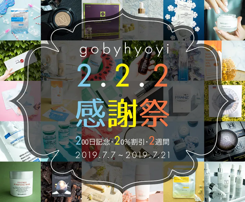 YOY style co.,ltd.(代表:Jung hyoyi ジョン ヒョイ)が運営する高品質な韓国スキンケア用品を販売するオンラインショップ「gobyhyoyi(ゴーバイヒョイ)」は、7月7日(日)をもちましてオープン200日を迎えます。日頃の感謝の気持ちを込めまして7月7日(日)~7月21日(日)2週間、全商品が20%OFFとなる200日2.2.2(※200日記念20%OFF2週間)感謝祭等、様々なイベントを開催いたします。