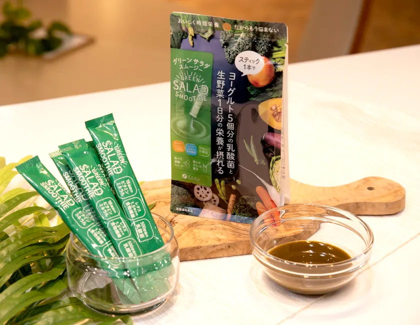 『グリーンサラダスムージー』は、健康への関心が高く、毎日忙しく過ごされている方のために、特に「時短」ニーズに注目し開発いたしました。本品(スティック)1本分の液体濃縮スムージーで1日目標量の野菜350g分に相当する食物繊維、ビタミン、ミネラルを摂ることができます。さらに、野菜だけでは摂れない乳酸菌をヨーグルト5個分配合しています。また合成着色料、合成甘味料不使用に仕上げており、ナチュラル志向の方にもおすすめです。