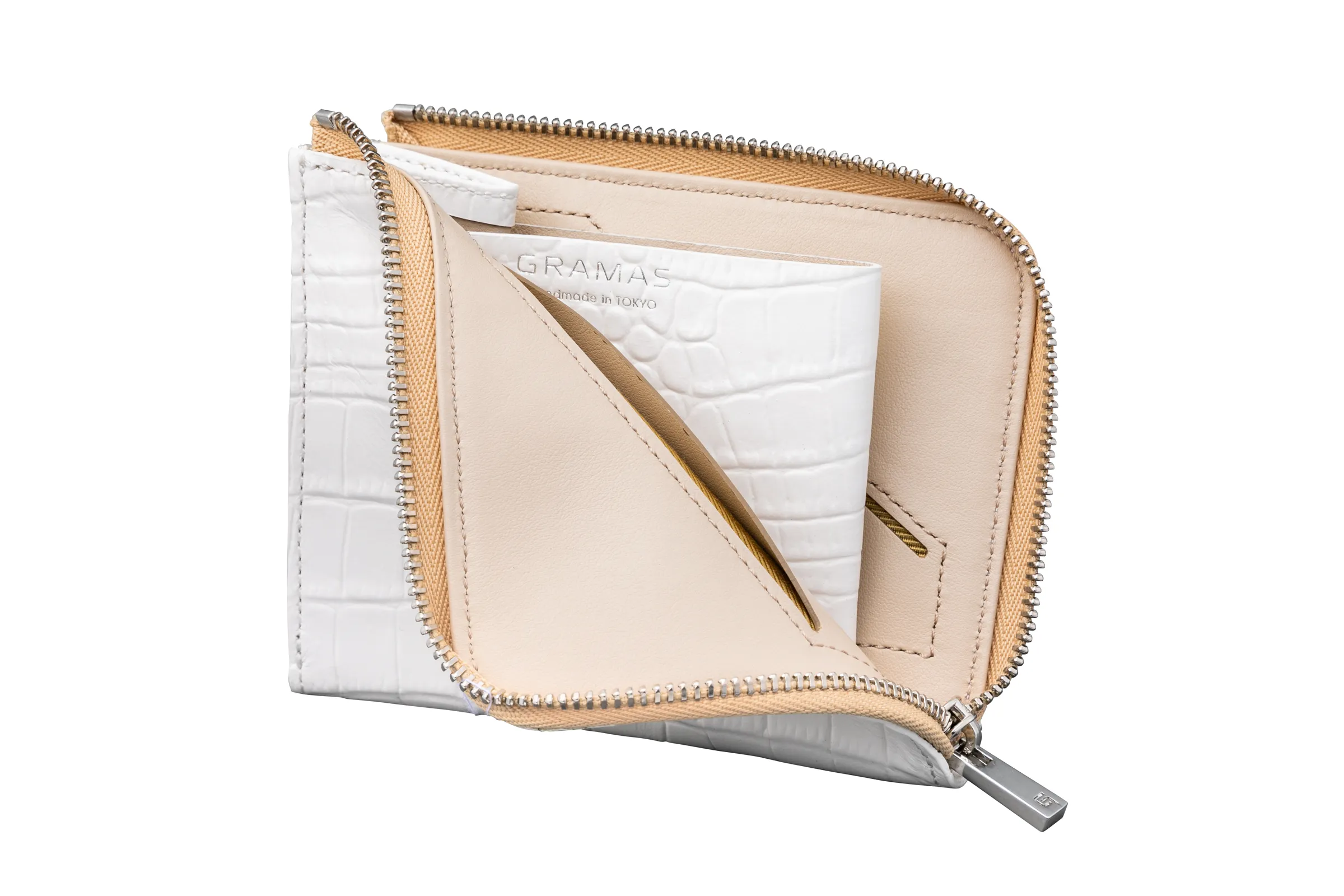 モノがあふれる時代にしっかりと必要なモノを選択して持ち歩くスタイルを、GRAMASから提案します。ホワイトのクロコダイル型押し本革を使用し、高級感とさわやかさを両立させました。