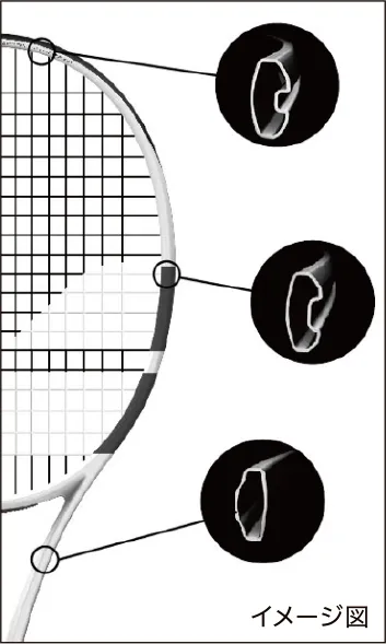 ボックス形状と楕円形状を組み合わせた独自のフレーム構造を採用しました。従来のボックス形状フレームに比べ、ハードヒットにおける安定性とレスポンスが格段に向上し、高精度なボールコントロールを可能にします。
