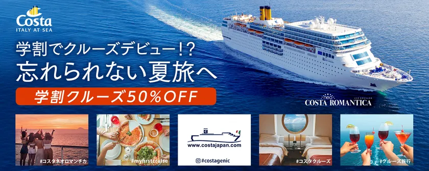 ヨーロッパ最大のクルーズ会社、コスタクルーズ(日本支社:東京都千代田区、日本・韓国支社長:浜岡 聡一)は、学生の夏休みシーズンに向けて「コスタ ネオロマンチカ」の『学割クルーズ』を新規に販売いたします。【(例) 8/24 福岡発着 5泊6日 ¥34,900~ 古都と城下町をめぐる麗しの日本海と釜山 Aコース 】