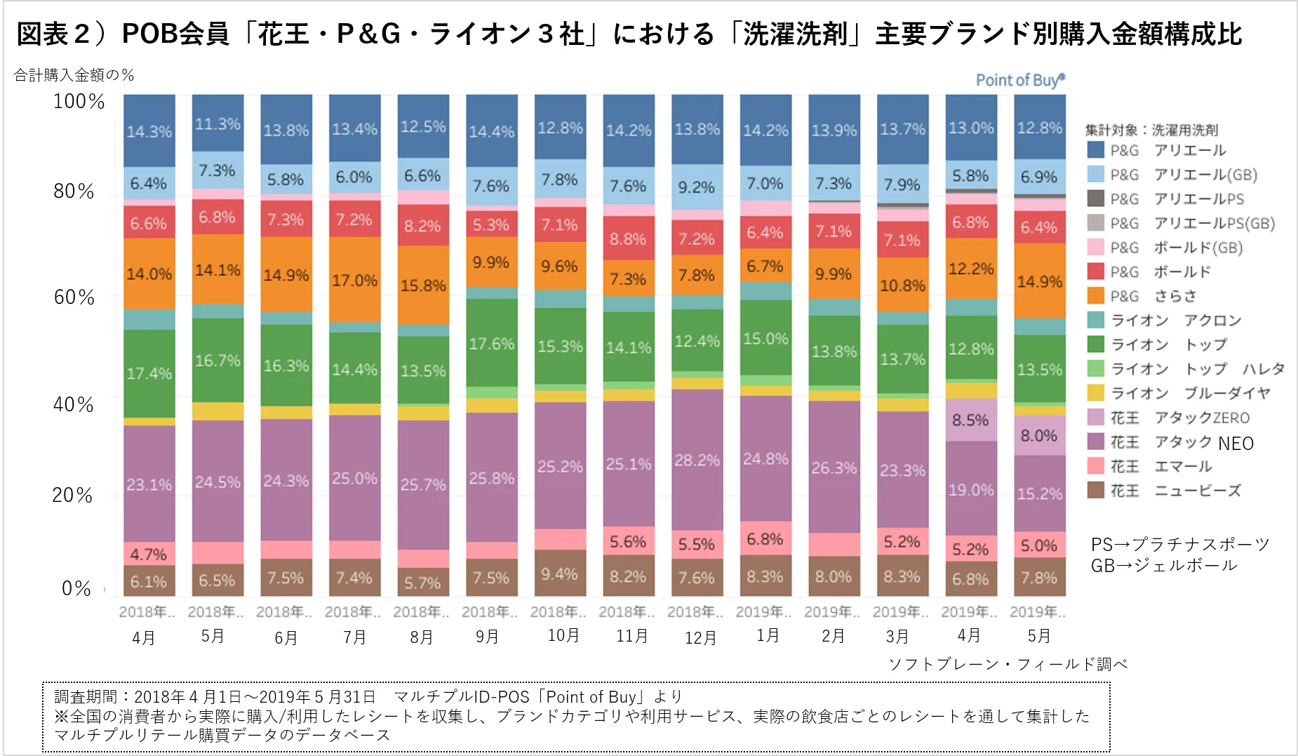 その後、19年2月にP&Gが主力の「アリエール」で“スポーツ”を切り口に「アリエール史上最強消臭洗浄力」を掲げる新商品「プラチナスポーツ」を投入。3月の購入金額構成比は37.6%で、前月35.4%より2.2ポイントアップしています。