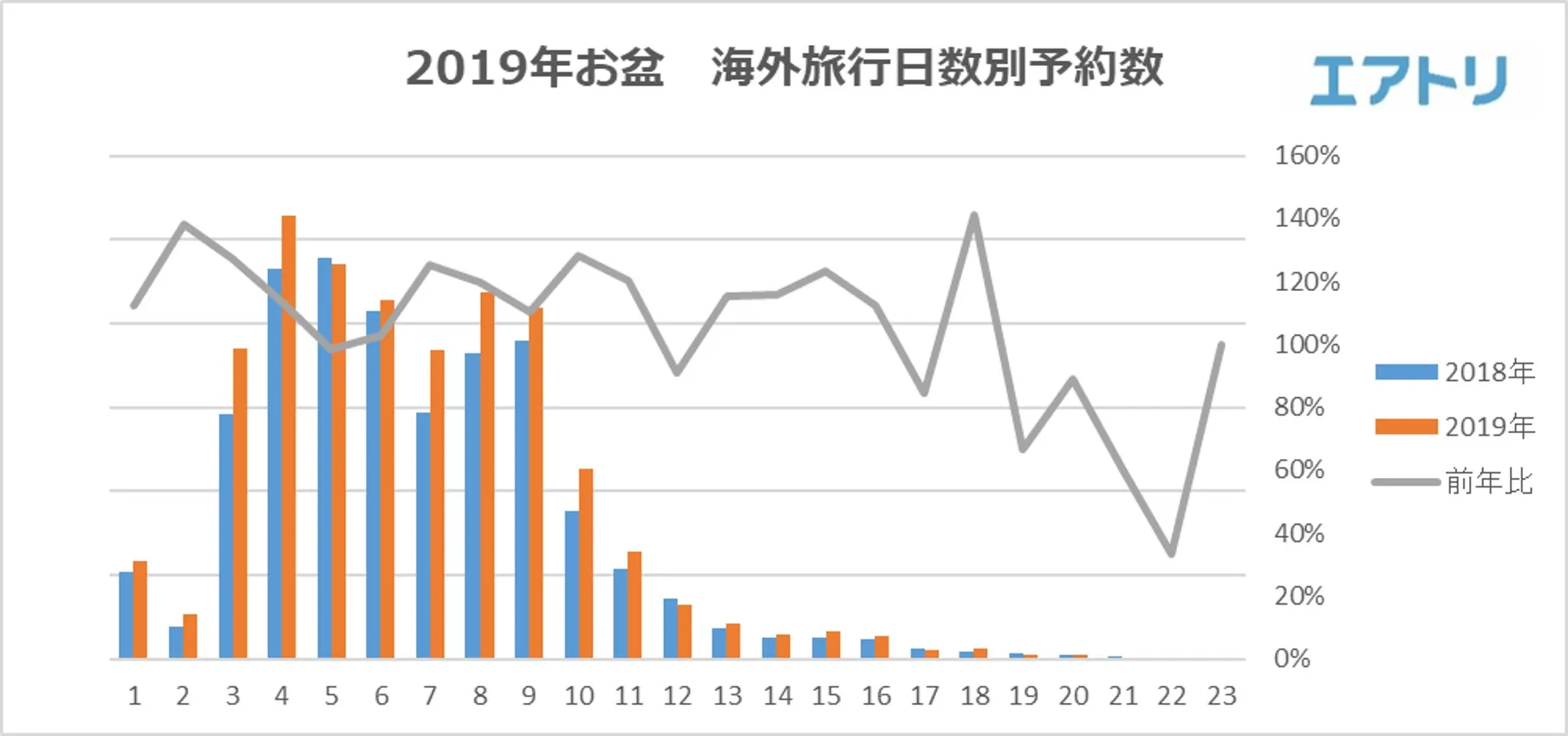 続いて、お盆時期(8月9日~18日)に出発する人の旅行日数を2018年と2019年で比較したところ、連休のほとんどを海外で過ごす予定の人も多く、6~10日間は昨年対比120%となっています。一方で、2・3日間も昨年対比128%と大幅に増加しており、G.W.で長期旅行をしたので夏休みは控えめに…という人が増えたのかもしれません。