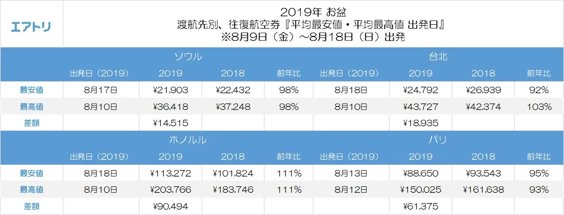 ソウル・台北・ホノルルに関してはお盆前半から後半にかけて金額が下がっており、ホノルルに関しては最高値と最安値で約9万円の差が出ました。一方、パリは日によって大きく変動しています。また最安値はソウル・台北・パリの3都市において昨年を下回っており、日程によってはお得に旅をすることができそうです。