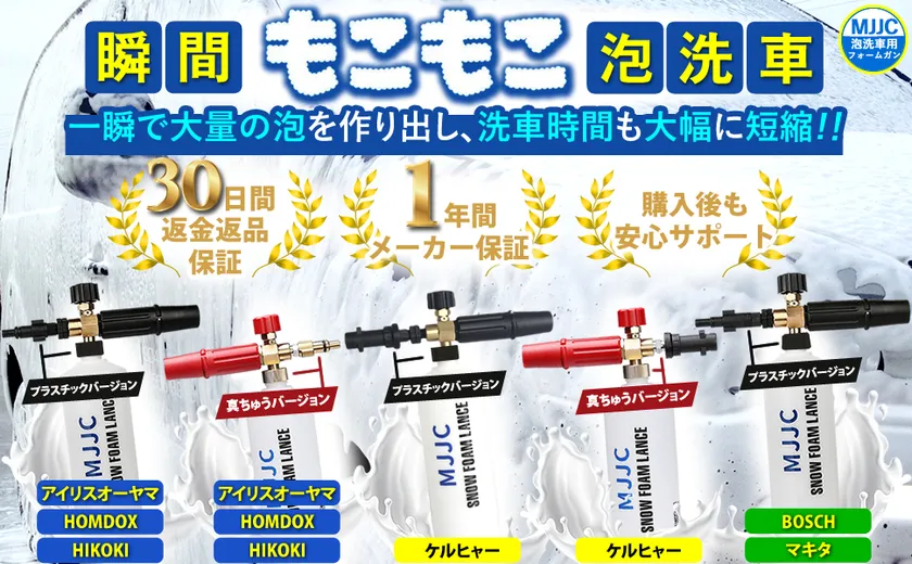 愛車の汚れをモコモコの泡洗車でピッカピカに! YouTubeでも話題!一瞬で大量の泡を作り出し、洗車が楽々になる 「MJJCフォームガン」が、大手6社の高圧洗浄機に対応して新登場!