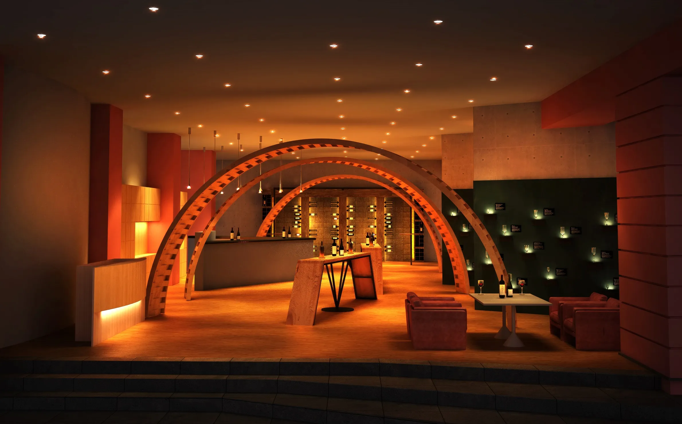 ワイン樽をリユースして造った大きなアーチが象徴的な空間には、ほのかにワインの香りが漂います。壁には、山梨県と長野県で造られたワインがずらりと並び、ライトアップされた30種類以上のワイングラスが美しく輝きます。ワインは期間毎にテーマを変えて提供され、ワインに合わせた軽食も味わえます。席は、互いの視界が重なるように配置した自然に会話が始まるカウンターテーブルと、ゆったりとしたソファーを備えており、時間を忘れてワイン談義に没頭できます。