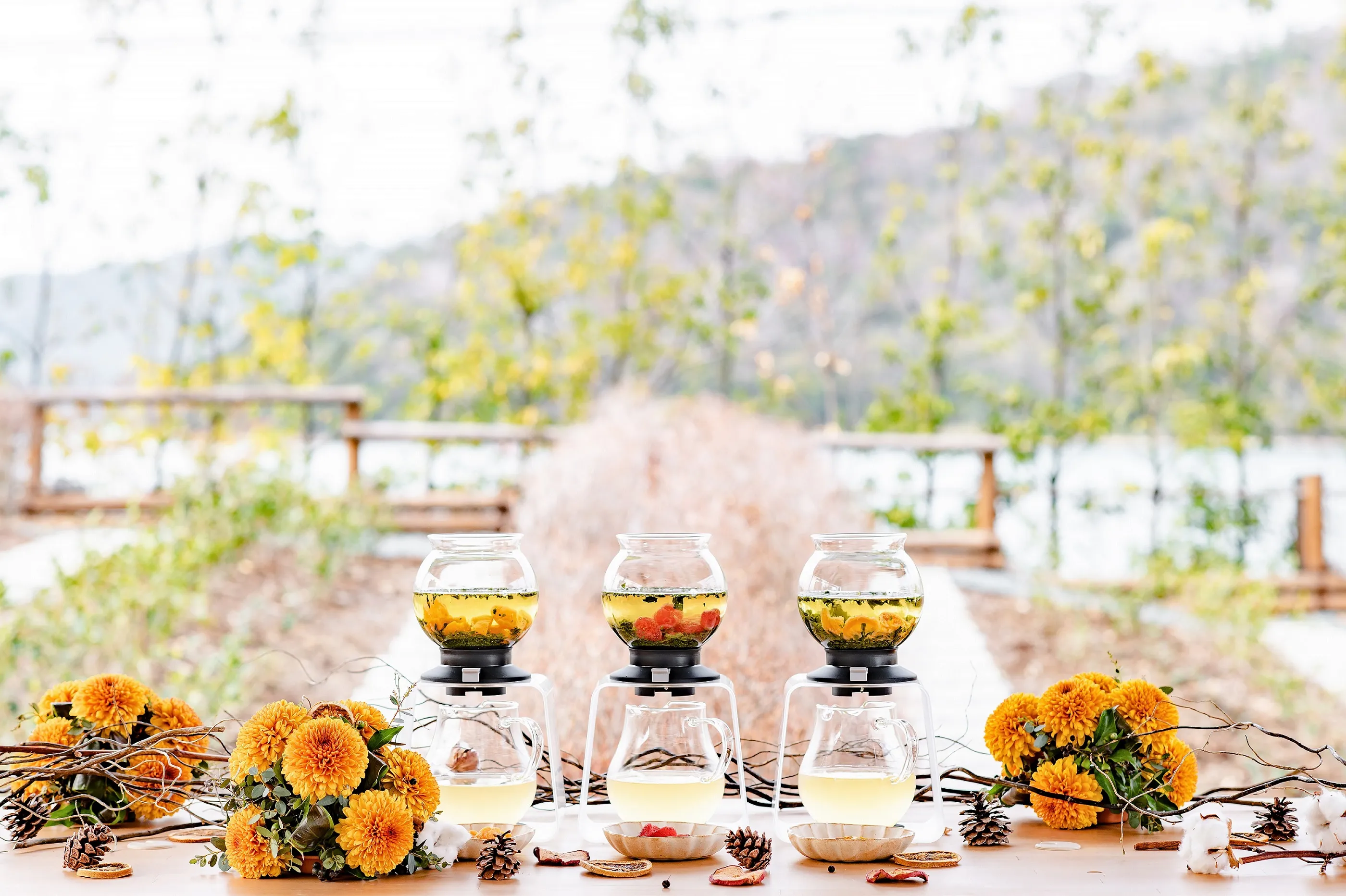 赤と緑の縦縞が印象的な紅葉つむぎ茶畑の中心にある四阿(あずまや)にて、果実熟成茶をふるまいます。秋の実りを感じる色鮮やかなドライフルーツと、コクのあるまろやかな熟成茶を合わせた秋らしいお茶です。ドライフルーツをお茶に加えることで、お茶もつむぎ茶畑のようにほんのり色づきます。浜名湖を借景に秋だけの絶景を眺めながら、色づいた果実熟成茶を飲み、ほっと一息つける時間です。