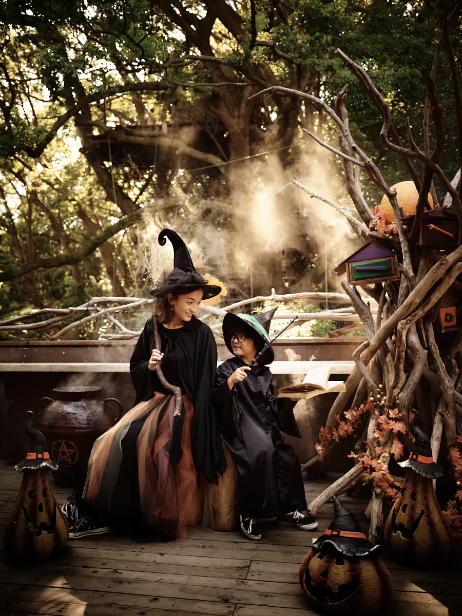 ホテル敷地内の屋外施設「森の空中基地 くすくす」にはシンボルツリーである、樹齢300年のくすのきがあります。このくすのきは、枝がうねった不思議な形をしており、まるで魔女が住んでいそうな雰囲気です。この木に佇むツリーハウスに「魔女の家」をイメージした装飾を施します。仮装をして写真を撮影したり、ティータイムを楽しんだりすることができます。