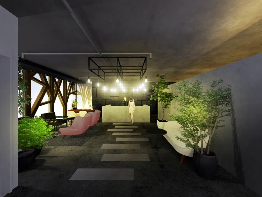 デザイナーは、人気リフォームTV番組等でもお馴染みの“三次元の冒険家”と呼ばれる「匠」西濱 浩次氏が監修。外観に現在のアーチ型の大窓を残しながら、一軒家をイメージして、玄関や庭に見立てた設計デザインです。一歩ホテルに入ると、まるでご自宅に帰ってきたような感覚になっていただけると思います。また、宿泊者用の共用キッチン、リビングのようなソファラウンジ、男女別大浴場も設置します。館内全体をご自宅のようにくつろいでお過ごしいただけるような、新しい宿泊スタイルを提供します。