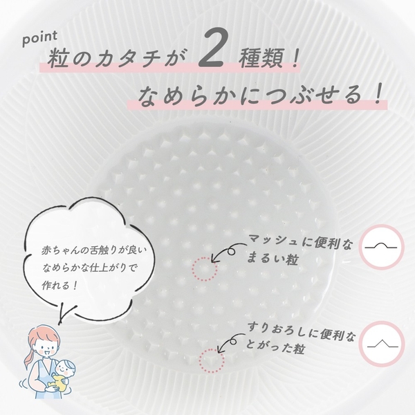 すり鉢の底にはマッシュに便利な"まるい粒"とすりおろしに便利な"とがった粒"があり、赤ちゃんの舌触りが良いなめらかな仕上がりで作れます。