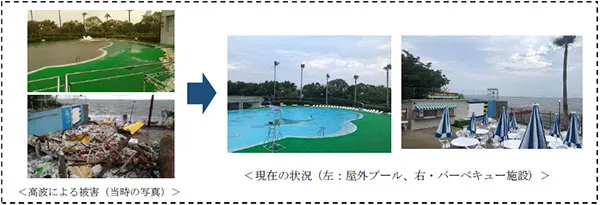 リゾ鳴尾浜は、2018年9月に上陸した台風21号に伴う高波により大きな被害を受けました。10日後に営業を再開したものの、その後も主要施設の復旧作業を続け、2019年3月、「急流とんねるスライダー」と「シーサイドバーベキュー施設」を復旧させることができました。