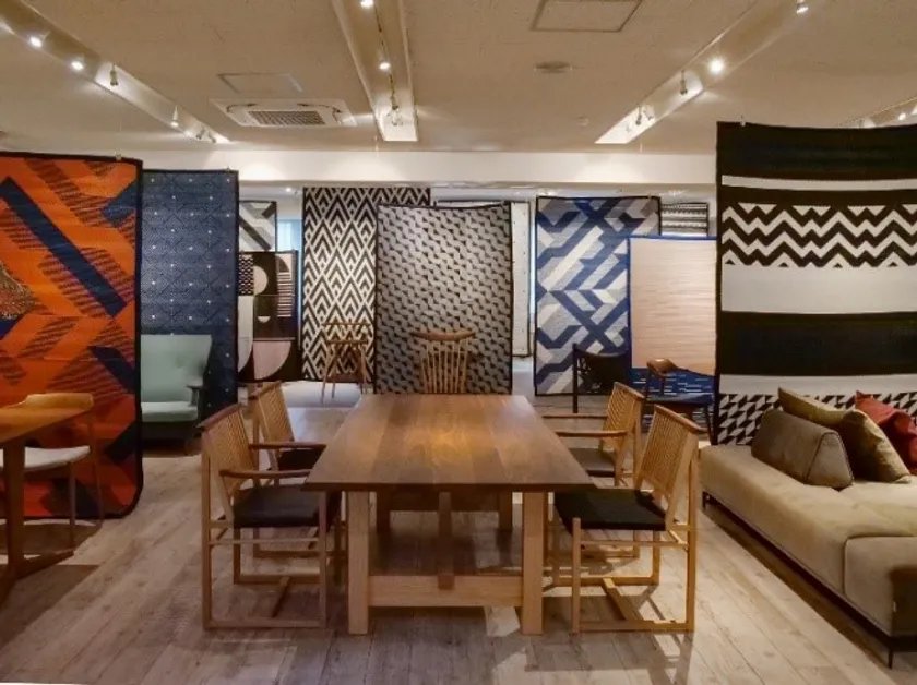 大阪 マルキン家具ショールームにて、デザイン性の高い「PDM洗えるラグマット」をタペストリーに見立てて展示