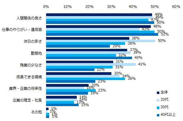 「どちらともいえない」「重視しない」と回答した方に月給以上に重視することを伺うと、トップ2は「人間関係の良さ」(49%)、「仕事のやりがい・達成感」(48%)でした。年代別で見ると、「30代」「40代以上」は半数以上の方が「仕事のやりがい・達成感」(20代:43%、30代:50%、40代以上:52%)と回答しました。