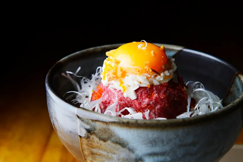○野菜と一緒にユッケを前菜としても爽やかに、さっぱり。