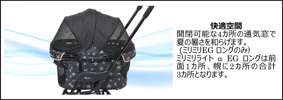 本製品「コムペット ミリミリEG ロング」は、メッシュ窓がカゴ部分に2カ所、幌に2カ所の合計4カ所にあり、通気性が高く快適に過ごせます。キャリーを外しペットハウスとして使う際には前面のメッシュ窓の開閉ができるので、ワンちゃん自身で出入りが可能です。