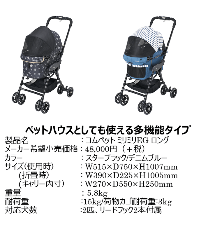 ベビー用品・乳幼児玩具などの開発・製造・販売を行うコンビ株式会社は、ペットのためのブランド「コムペット(compet)」から、いろいろな場所にワンちゃんとお出かけの夢をかなえるペットカート「コムペット ミリミリEG ロング」と「コムペット ミリミリライト α EG ロング」を2019年7月下旬に発売いたします。
