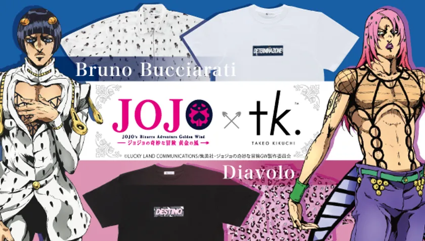 TVアニメ「ジョジョの奇妙な冒険 黄金の風」とアパレルブランド「tk.TAKEO KIKUCHI」がコラボレーション。作中に登場するギャング組織「パッショーネ」に君臨する帝王ディアボロと、相対するブチャラティをモチーフにした柄シャツや、アニメのハイライトシーンからインスパイアされたデザインTシャツなど、全10種類の展開になります。