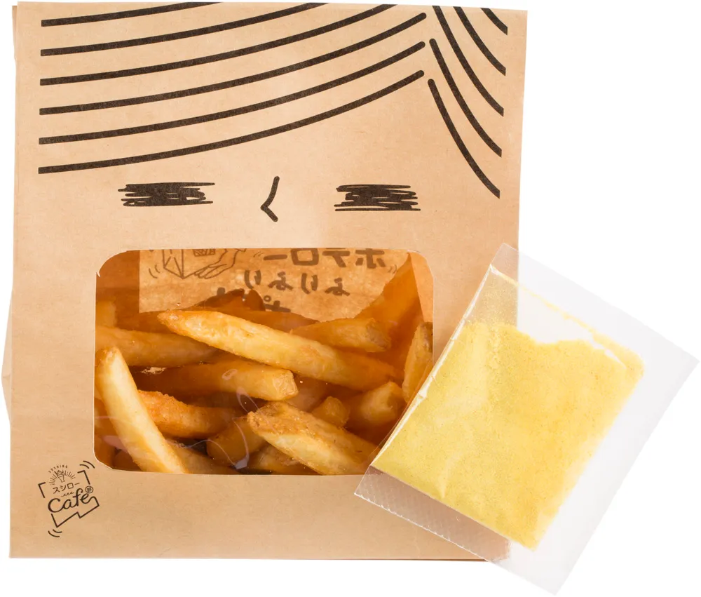 『ポテローのふりふりポテト』は、スシローの充実したサイドメニューの中でも屈指の人気を誇る『フライドポテト』をいつもの2倍の量に増量し、お好みのフレーバーをふりふりと絡めてお客様自身で楽しみながら召し上がっていただける商品です。「のり塩味・サワークリーム味・カレー味」の3種類の選べるフレーバーをご用意いたしました。顔がデザインされている袋は3種類あり、口の形をした窓からフレーバーを混ぜているところが見えるよう遊び心のあるデザインに仕上げています。