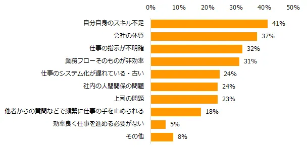 一方、効率的に働けていないと回答した方に理由を伺うと、「自分自身のスキル不足」(41%)が最多となりました。