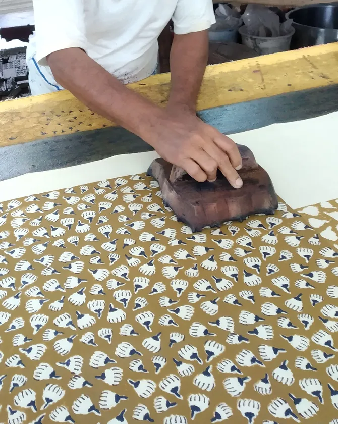 ブロックプリントとは、 手彫りの木版にインクを付け、布にひと押しひと押し柄付けをする、インドやバングラデシュの伝統的な工芸のこと。