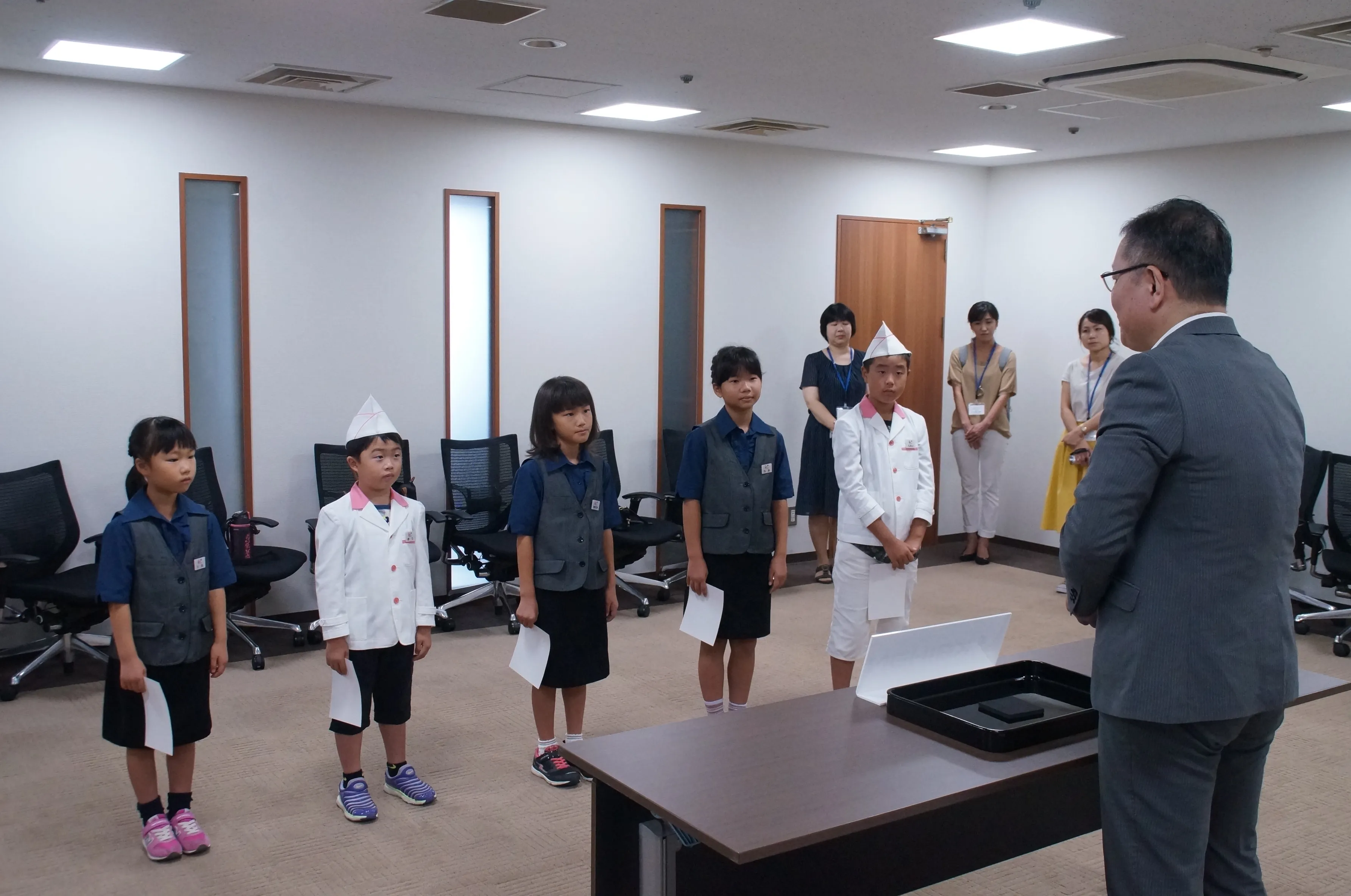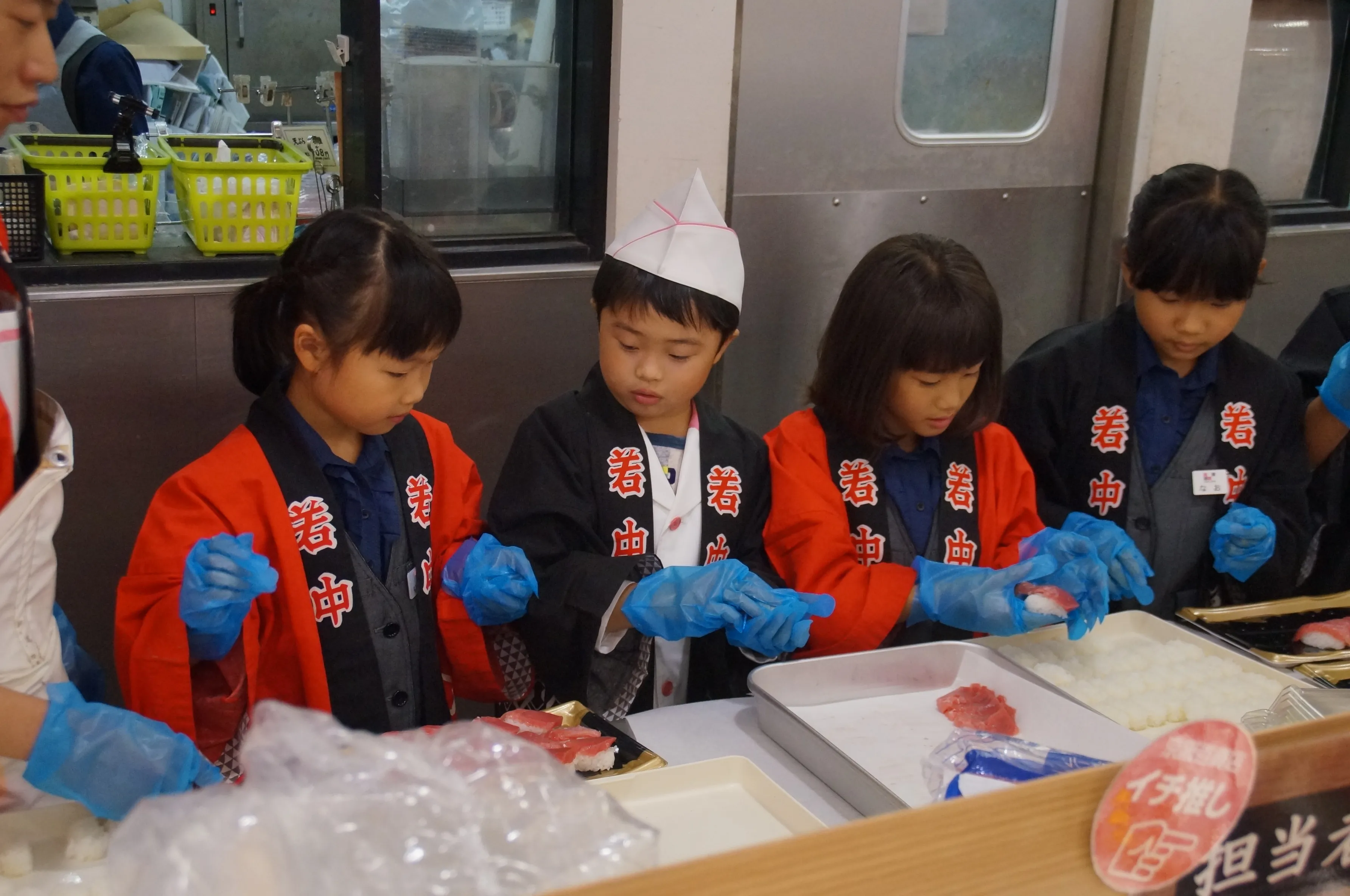 キッズ社員は3人一組となって百貨店内の仕事場をツアー形式で回り、それぞれの先輩社員の教えを受けながら、開店時のお客様のお出迎えや、プレゼントのラッピング、お寿司づくりなどの仕事を順番に体験します。普段のお買物の際には見られない「辞令式」や「商品づくり」など、百貨店の仕事の裏側も体験することができるため、毎年多数の応募がある人気企画です。
