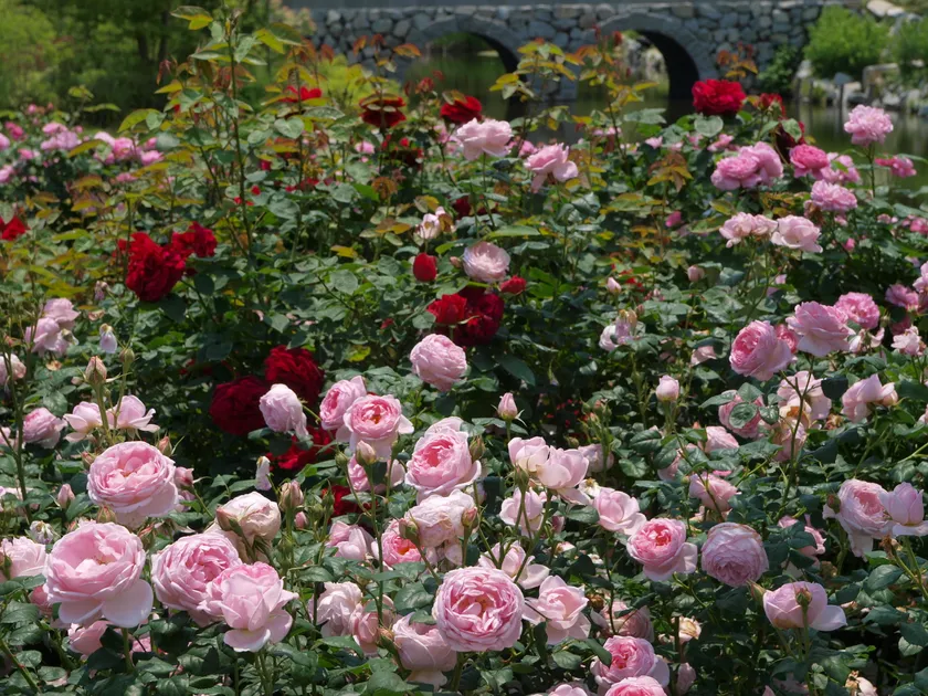水辺の庭園を中心に、四季折々の草花とバラの競演が楽しめるローズガーデン等、8つのエリアを展開しています。変化に富むランドスケープが人気です。
