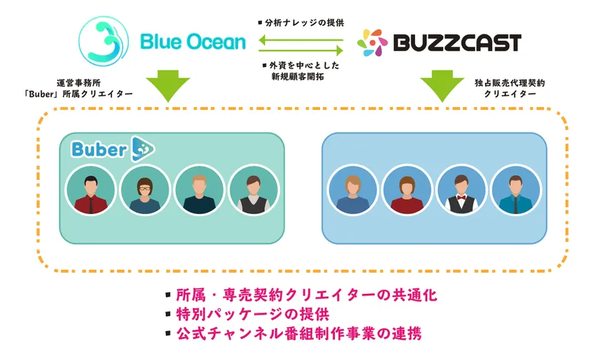 動画コンテンツ・マーケティングを展開する株式会社BUZZCAST(所在地:東京都豊島区、代表者:山田 雄介、以下 当社)は、広告代理業、インフルエンサー事務所事業、スタジオ運営事業を行なっている株式会社ブルーオーシャン(所在地:東京都中央区、代表者:王 博、以下 ブルーオーシャン)と提携し、両社の所属・独占販売契約クリエイターの共通化、新規パッケージ商品の提供を開始します。