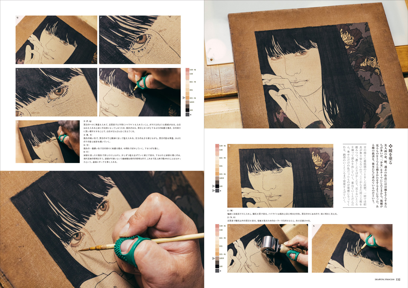独学から生まれたという自身で染め上げた麻布に岩絵具で描く美人画が、独特な質感と芳香を放ち、文房具や本の装丁など海外からのオファーも多い。