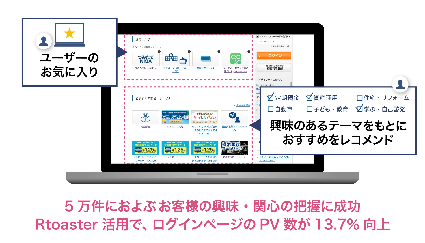横浜銀行は、ダイレクトチャネルにおけるOne to One対応をさらに推し進めるため、インターネットバンキングのログインページを、お客様一人ひとりに最適なサービスを提案するための「マイページ」としてリニューアルしました。このリニューアルにおいて、「Rtoaster」の基本機能を活用した施策を実施し、リニューアル前と比較してPV数が13.7%増加しました。