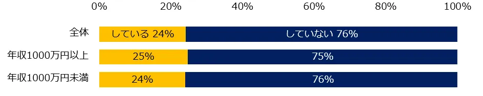 副業中の方に、具体的な取り組みを尋ねたところ、もっとも多かった回答は「本業以外の単発の仕事」(45%)でした。年収別にポイント差が目立ったのは、年収1000万円以上は「株式投資」(36%)、「不動産投資」(29%)、「ボランティア活動」(26%)、「地域活動」(18%)。年収1000万円未満は「本業以外の単発の仕事」(46%)でした。