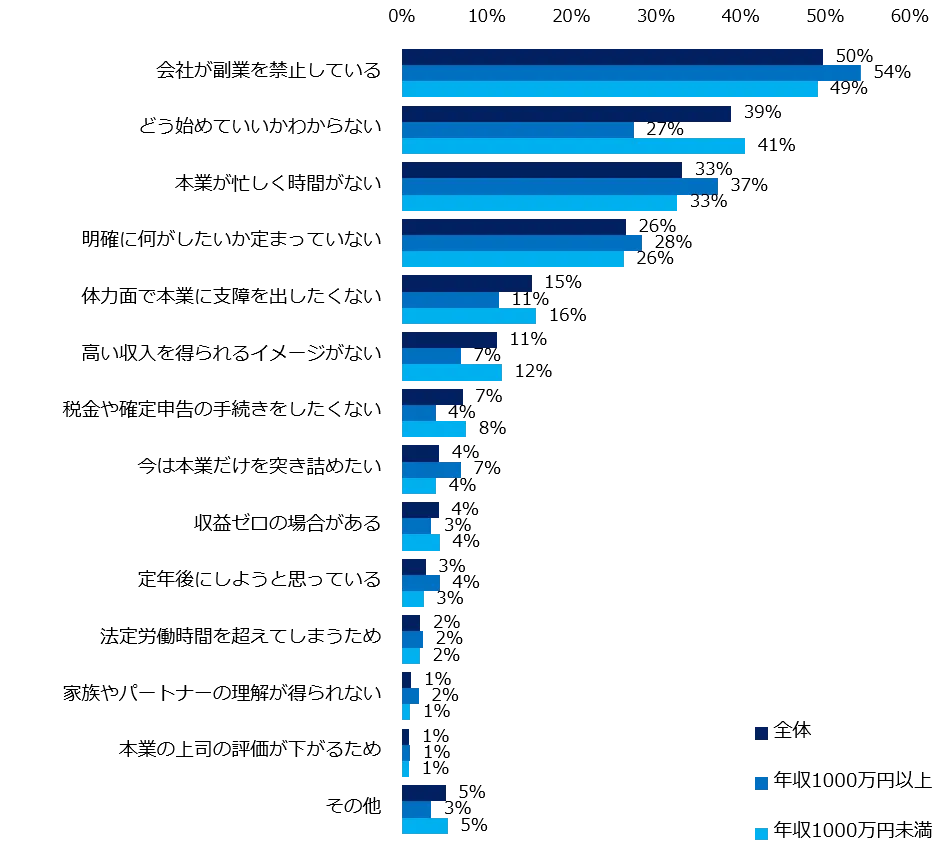 副業をしていない方に理由を尋ねたところ、第1位は「会社が副業を禁止している」(50%)、第2位は「どう始めていいかわからない」(39%)、第3位は「本業が忙しく時間がない」(33%)でした。働き方改革の一環として副業解禁が企業へ促される中、企業での制度整備が進んでいない現状が分かりました。