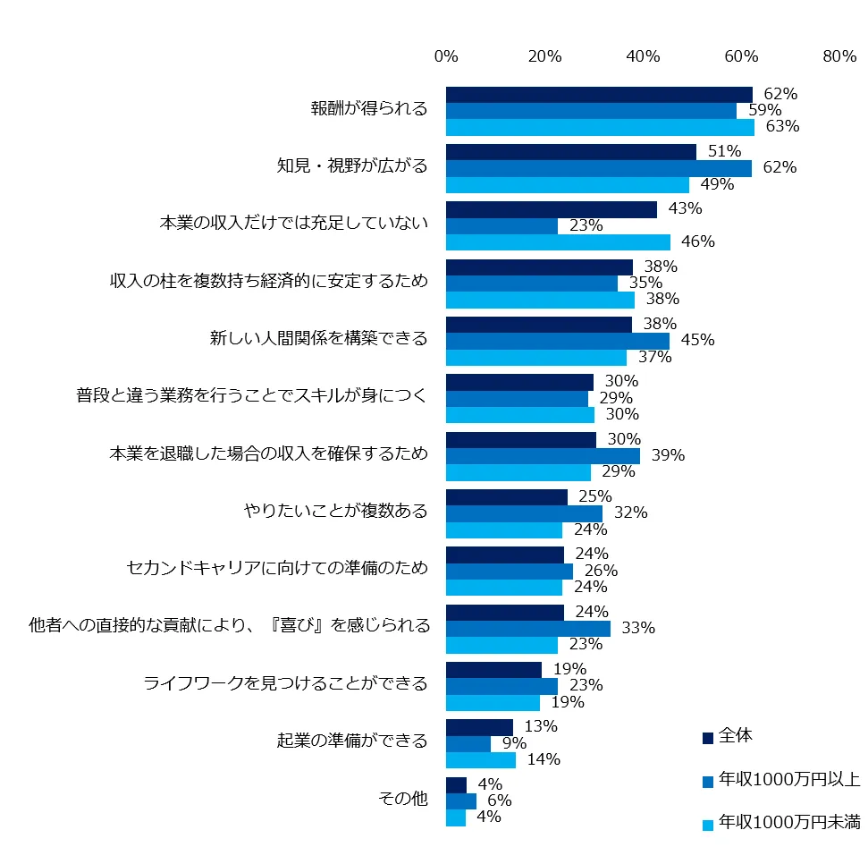 年収別にポイント差が目立ったのは、年収1000万円以上は「知見・視野が広がる」(62%)、 「本業を退職したときの収入を確保するため」(39%) 「他社への直接的な貢献により、『喜び』を感じられる」(33%)、「他社への直接的な貢献により、『喜び』を感じられる」(33%) 。年収1000万円未満は「本業の収入だけは充足していない」(46%)、「起業の準備が出来る」(14%)でした。年収1000万円以上は、仕事を通じた充実感や成長、年収1000万円未満は収入アップが目的のようです。