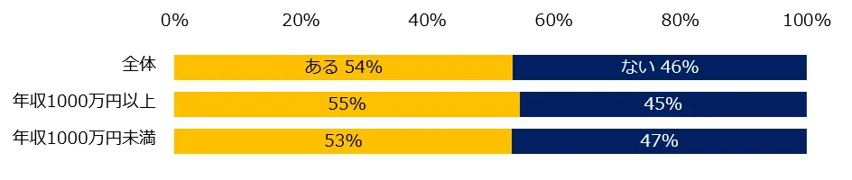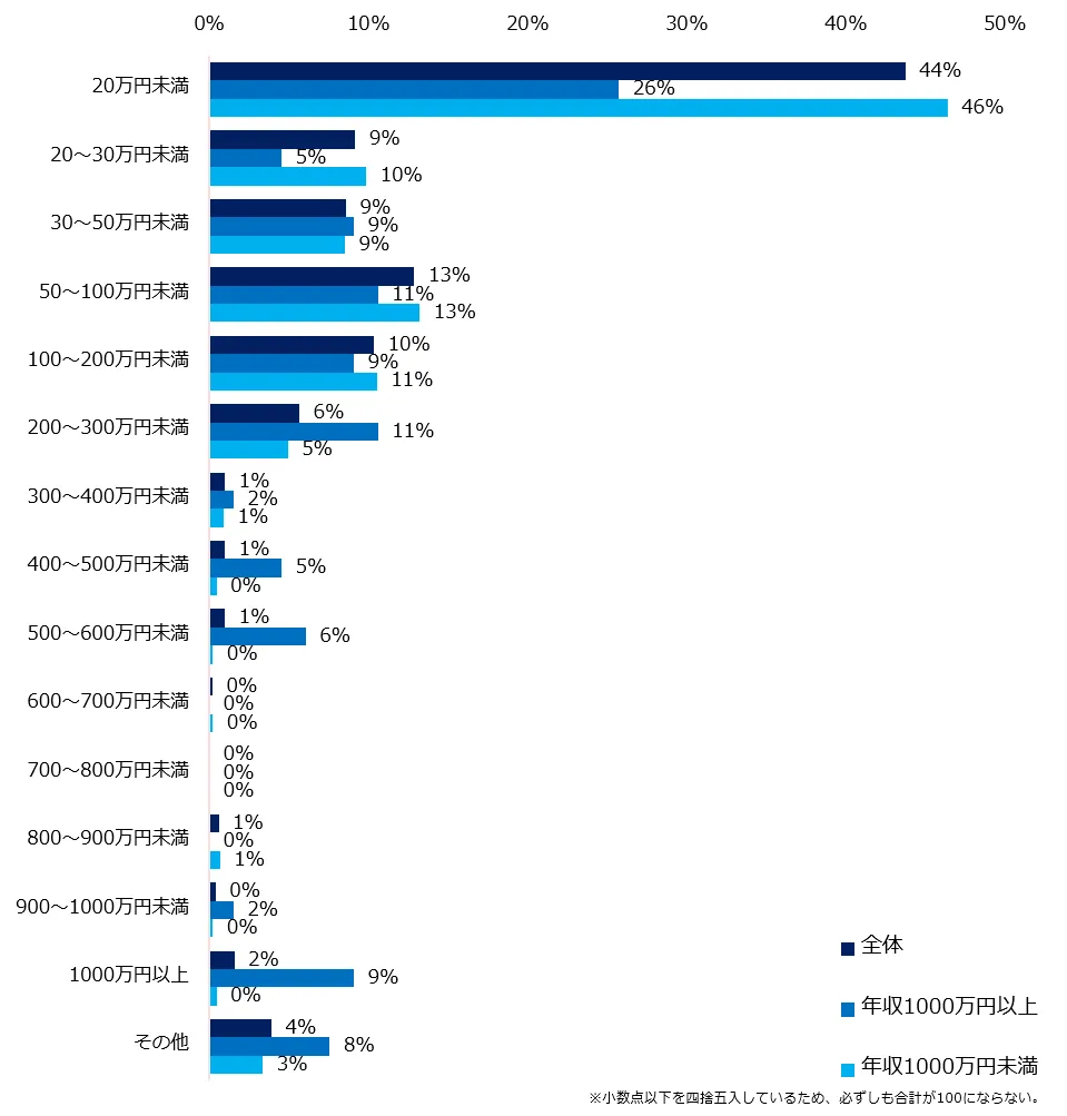 副業の年収を伺ったところ、44%が「20万円未満」と回答。年収1000万円未満が、300万未満に回答が集中する中、年収1000万円以上は「400万~500万未満」(4%)、「500万~600万未満」(6%)、「1000万以上」(9%)と回答する方が見受けられました。