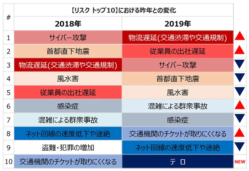 調査では、東京2020大会に向け、各組織として、どのようなリスクについて特別に対策を講じる必要があると考えているかを点数により評価してもらいました。その結果、トップ10には、「物流遅延(交通渋滞や交通規制)」「従業員の出社遅延」「サイバー攻撃」「首都直下地震」「風水害」「混雑による群衆事故」「感染症」「交通機関のチケットが取りにくくなる」「ネット回線の速度低下や途絶」「テロ」が入り、昨年と比べ、交通問題やサイバー攻撃等、より身近で発生可能性が高いリスクへの危機感が高まっている傾向が浮き彫りになりました。