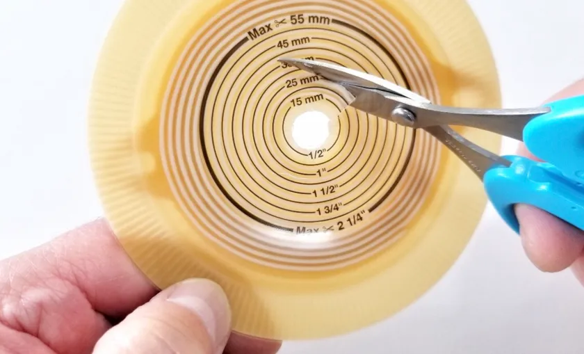 ストーマには筋肉がないので排せつをコントロールできません。このためストーマから出る排せつ物を受け止める袋状の装具をおなかに貼り付けます。その際に必要になってくるのがハサミです。自分に合ったサイズの穴を装具に開けなければならないのです。