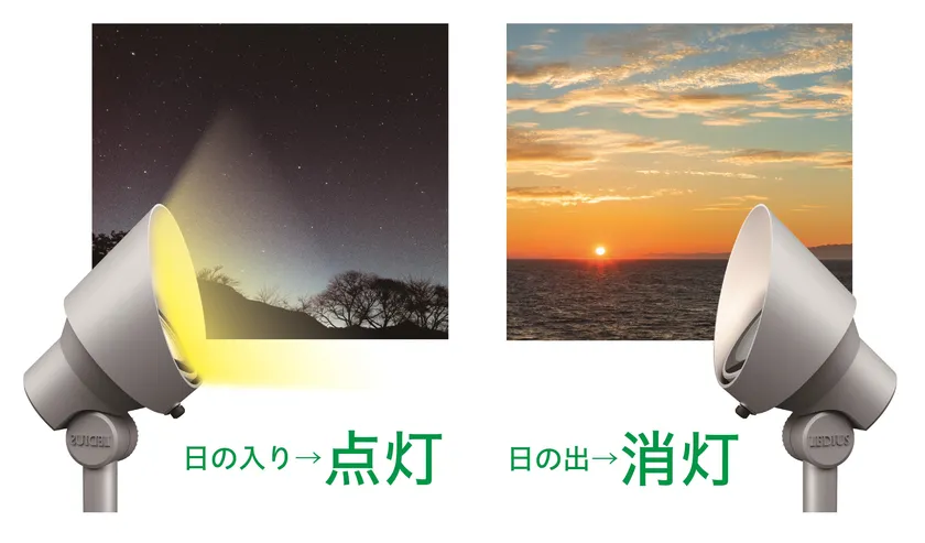 (1)GEMS(R)アプリで登録した設置場所の緯度経度情報から、お住まいの地域の日の出・日の入り情報を自動で取得。日の入り時間に合わせて自動で点灯、日の出時間に合わせて自動で消灯、設置環境に左右される照度センサーの精度に依存されることがありません。