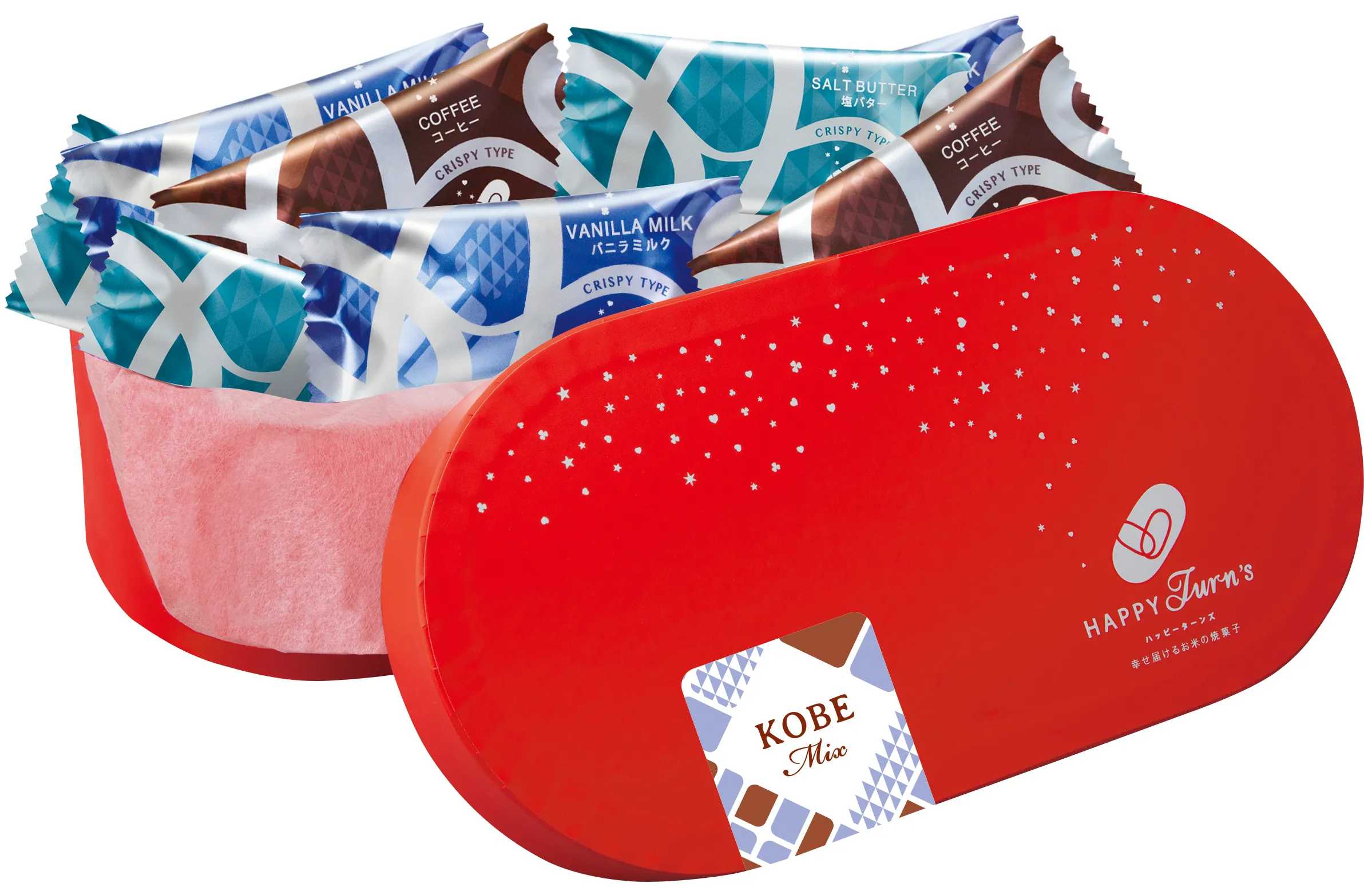 7月26日(金)に、常設店舗の3号店がそごう神戸店にオープンいたします。神戸初出店を記念し、通常のラインアップに加え、神戸店限定商品『ハッピーターンズ ハッピーポップ 神戸ミックス』を発売いたします。『ハッピーターンズ ハッピーポップ 神戸ミックス』は、淹れたてコーヒーのような香りとビターな大人の味わいを楽しめる「コーヒー」、ミルクのコクとバニラの芳醇な香りが広がる「バニラミルク」の神戸限定フレーバー2種に加え、人気No.1フレーバーの「塩バター」を詰め合わせた3種アソートです。素材の口どけや香りにこだわったプレミアムなハッピーターンをぜひお求めください。