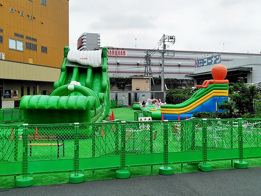 特大スライダーの高さはなんと7.5m。スライダーに上ると辺りを一望できます。この高さから滑り落ちる速さをぜひ体感してください。タコが乗っているスライダーも昨年に引き続き登場。特大スライダーよりは低くなりますが、小さなお子様でも楽しめる安心設計となっております。