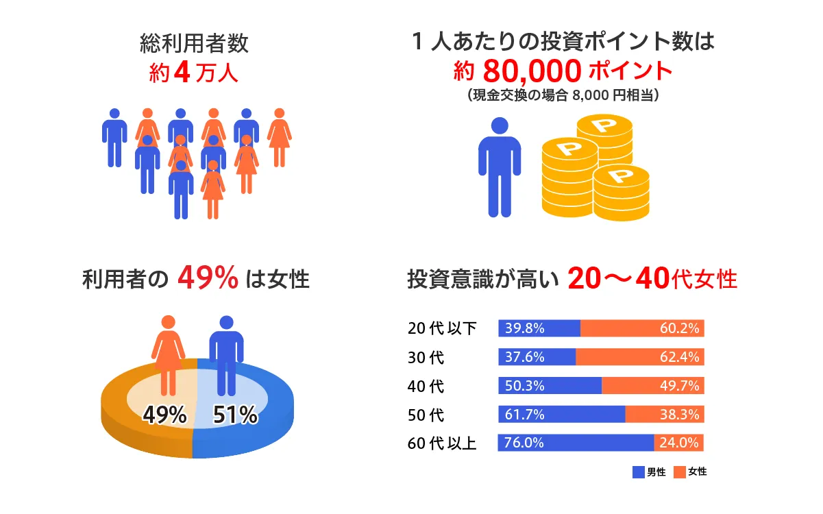 ~利用者数4万人。女性の利用率も49%と高く、1人あたりの投資ポイント数は約80,000ポイント~