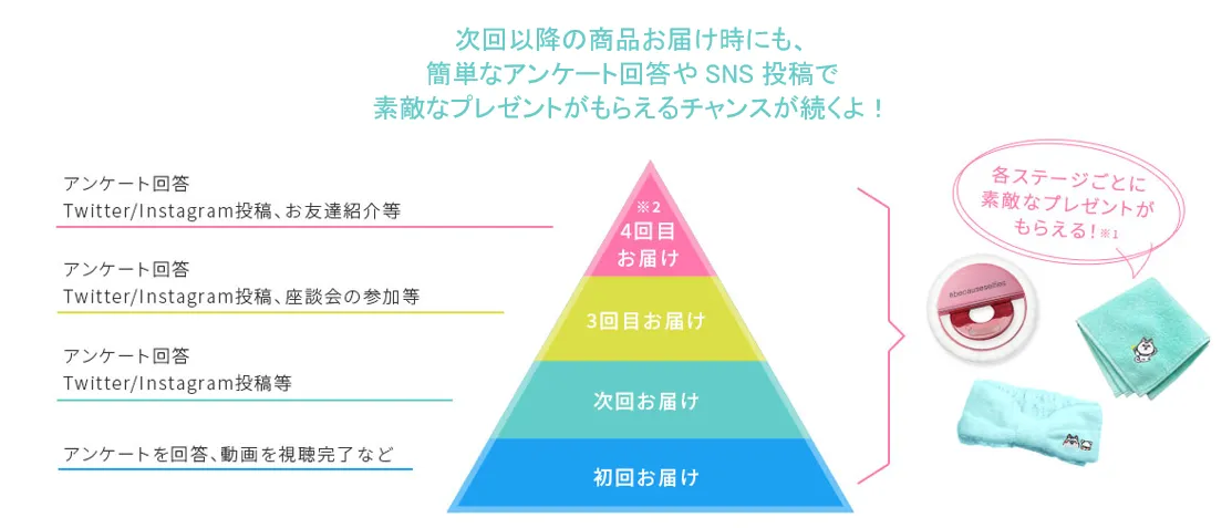 エントリーいただき、定期的に下記のようなアクティビティに参加すると、プロアクティブのおすすめ豪華4点セット+選べるプレゼント(アドバンストモイスチャーセット通常の90日サイズ)を月々4,900円※で気軽にご利用いただけます。その他にもイベントへの招待やプレゼントもご用意しました。
