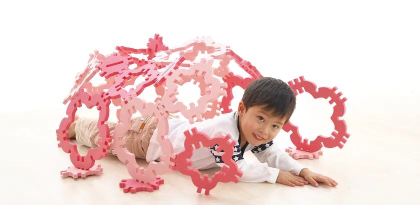 大きな知育パズル「クムタス」シリーズに“おはな”が登場! ピンク色の全24パーツの組み合わせで秘密基地やトンネルが作れる