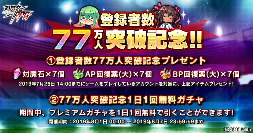 2019年7月25日14:00までに当ゲームをプレイしているお客様を対象に「対魔石×7個」「AP回復薬(大)×7個」「BP回復薬(大)×7個」をプレゼントいたします。