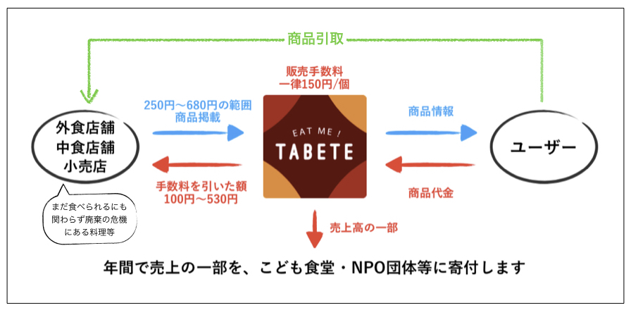 コークッキングは2018年4月から、外食・中食事業者向けに、まだ安全においしく食べることのできる売れ残りや廃棄予定の食品と買い手(「食べ手」)をつなぐ、フードシェアリングプラットフォーム「TABETE」を運営しています。現在は同サービスにより、首都圏・関東を中心に14万人以上の「食べ手」と300店舗以上をつないでいます。「TABETE」のアプリを通じて、利用者(「食べ手」)は美味しくお得に商品を購入でき、また「食べ手」になることで、食品ロス削減にも取り組むことができる仕組みとなっています。