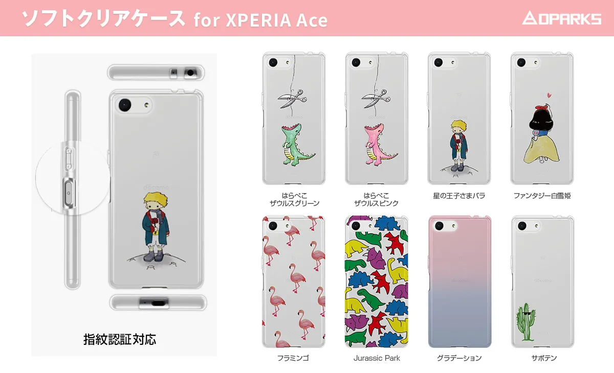 | 商品名 :Xperia Ace ソフトクリアケース 商品ページ :http://www.mycaseshop.jp/ds20164 バリエーション :はらぺこザウルス グリーン・ピンク、星の王子さま バラ、ファンタジー 白雪姫、フラミンゴ、Jurassic Park、グラデーション、サボテン (全8種) 素材 :TPU 本体重量 :19g 価格 :1,600円(税抜) |