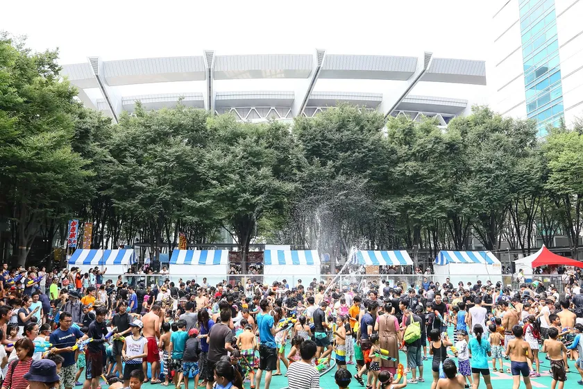 水をかけあって楽しむ、さいたま新都心夏の恒例イベント