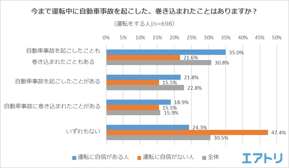 ―事故を起こした、あるいは巻き込まれた経験があるのは運転に「自信がない」人は52.6%だったのに対し、「自信がある人」は75.7%となり、20ポイント以上の差が出ました。
