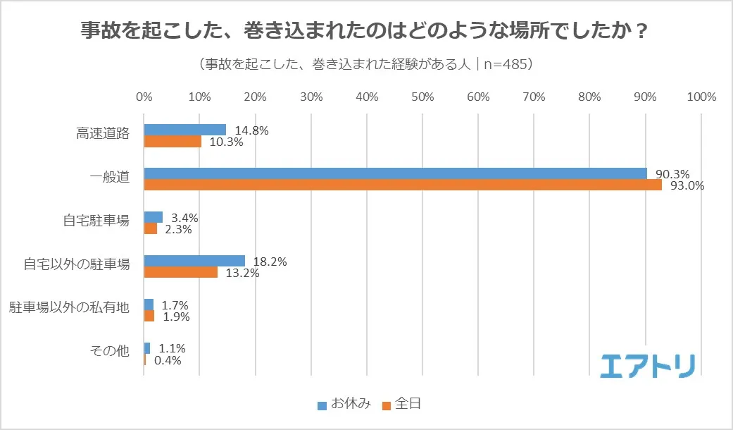 ―「お休み」と「全日」で比較したところ、お休みに事故割合が増加したのは「高速道路」と「自宅以外の駐車場」でした。