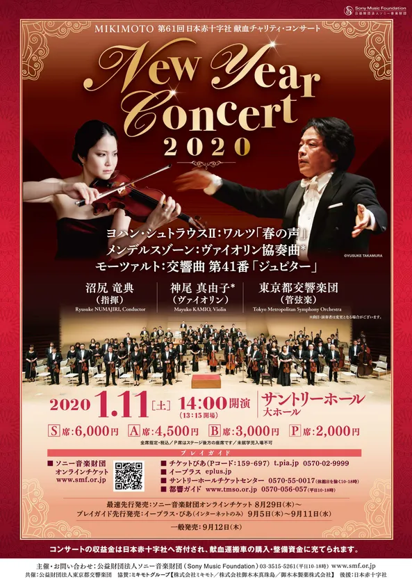 公益財団法人ソニー音楽財団(所在地:東京都千代田区、理事長:加藤 優、英文名称:Sony Music Foundation)は、2020年1月11日(土)、サントリーホールにて「MIKIMOTO 第61回 日本赤十字社 献血チャリティ・コンサート New Year Concert 2020」を開催いたします。