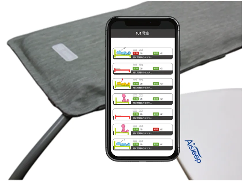 AiSleepは、非接触で、布団の下にセンサーマットを敷くだけで簡単に設置ができます。インターネットを経由して生体データをクラウドに転送し、介護者の異常と変化を即座に関係者へ通報します。AiSleepを介護施設に導入することにより、職員は要介護者に適切なタイミングでの訪室や声掛けができたり、モバイル情報端末で通知を受けられるなどの対応が可能となり、安全、安心、そして介護業務の負担の軽減や業務効率の改善に伴い省力化が期待できます。